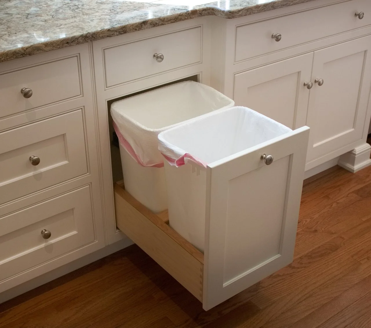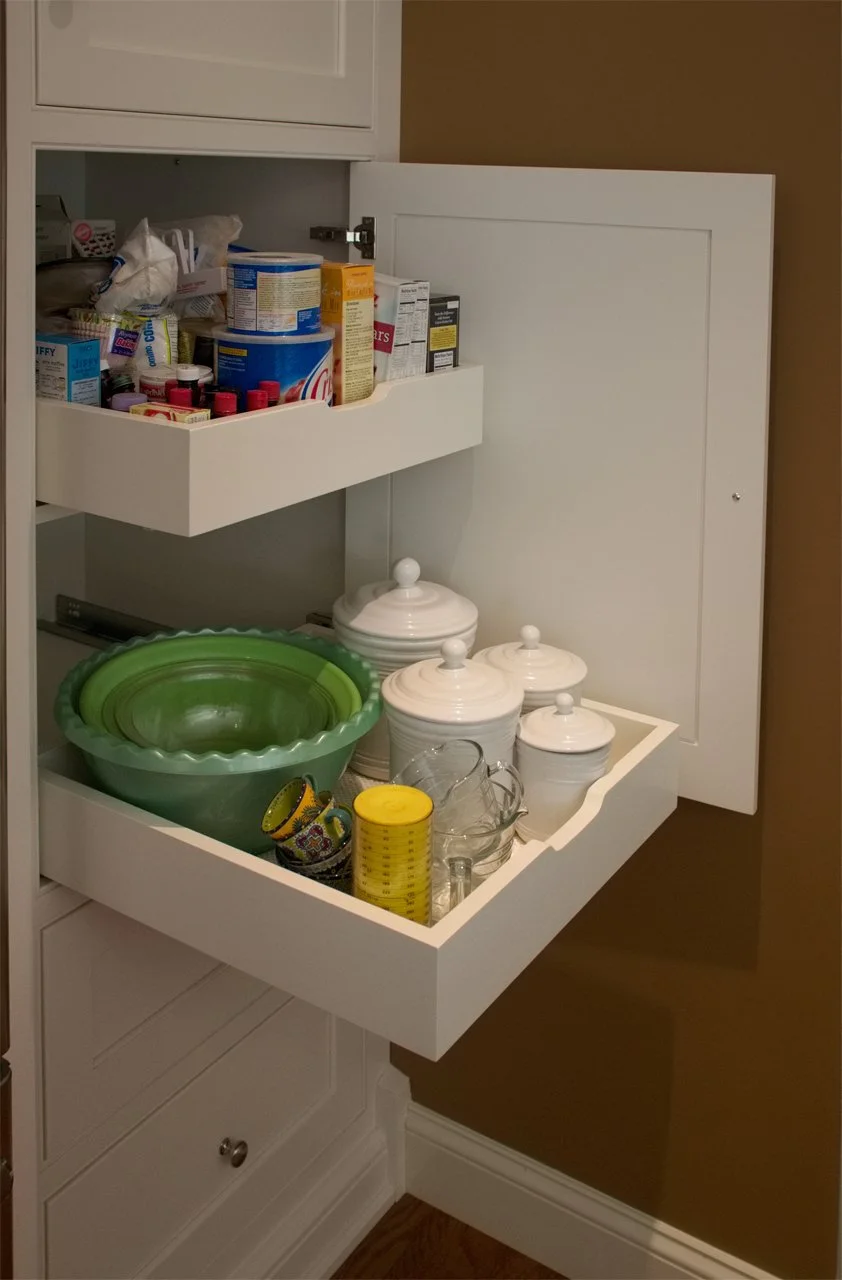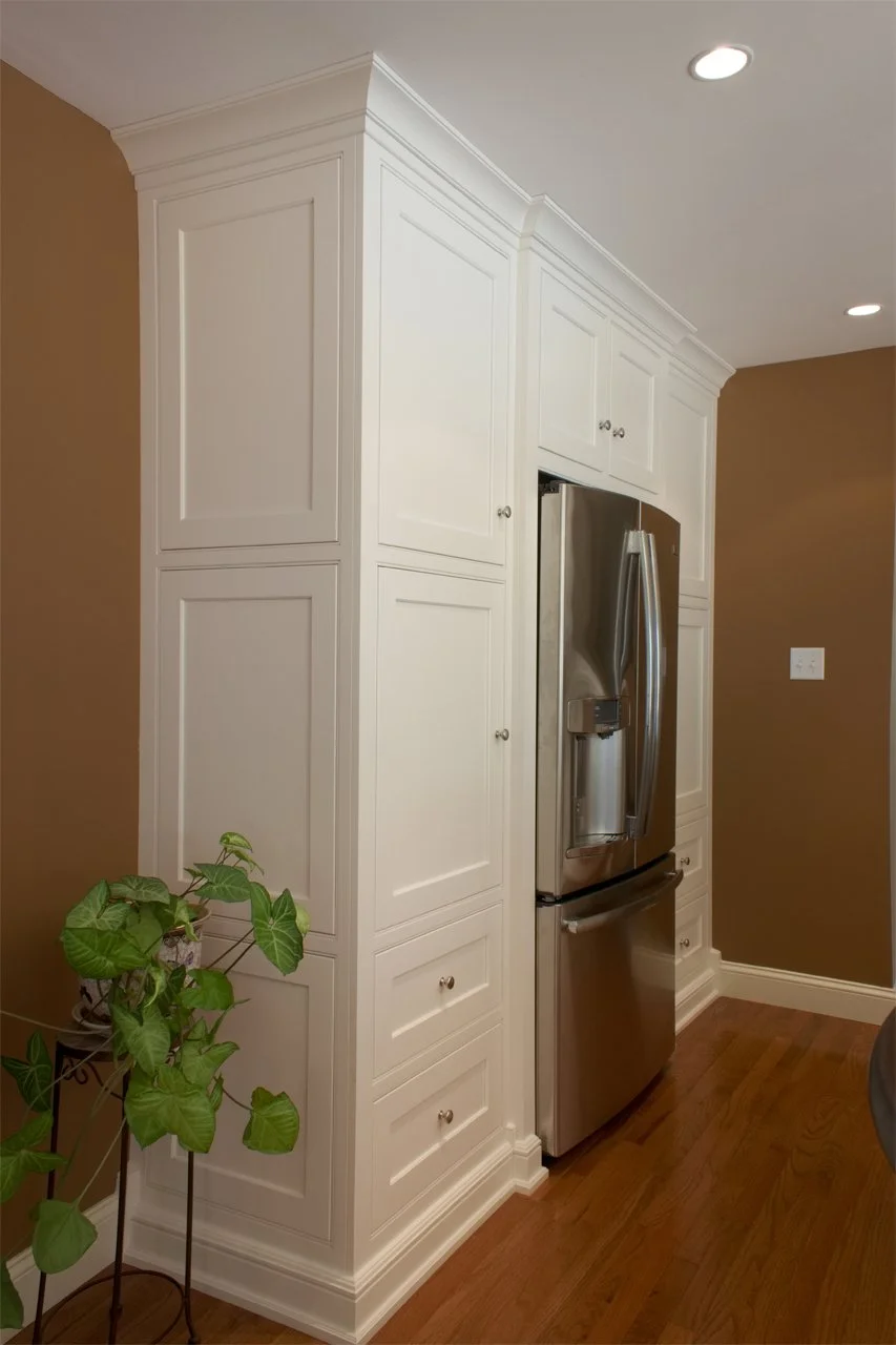 This kitchen also features some of our custom drawer and cabinets inserts, including a knife block, trashbin, and shelf slide-outs. The fridge surround is massive with full-sized cabinets flanking both sides and extra storage above.