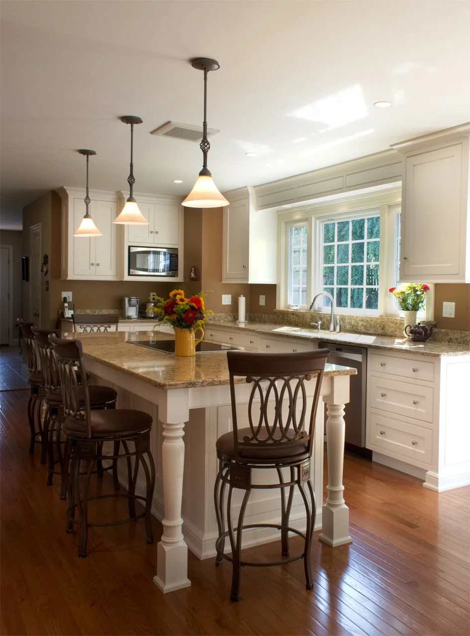 This kitchen features a large working table island that houses the glass-top range and two ovens. Originally the kitchen only had a single square window, but at our recommendation, Diane and Chris expanded the window and added a lightbridge overhead. They also took our recommendation to extend the quartz backsplash up to meet the window, making the sill out of quartz to allow the eye to flow from the counter to the window without interruption.